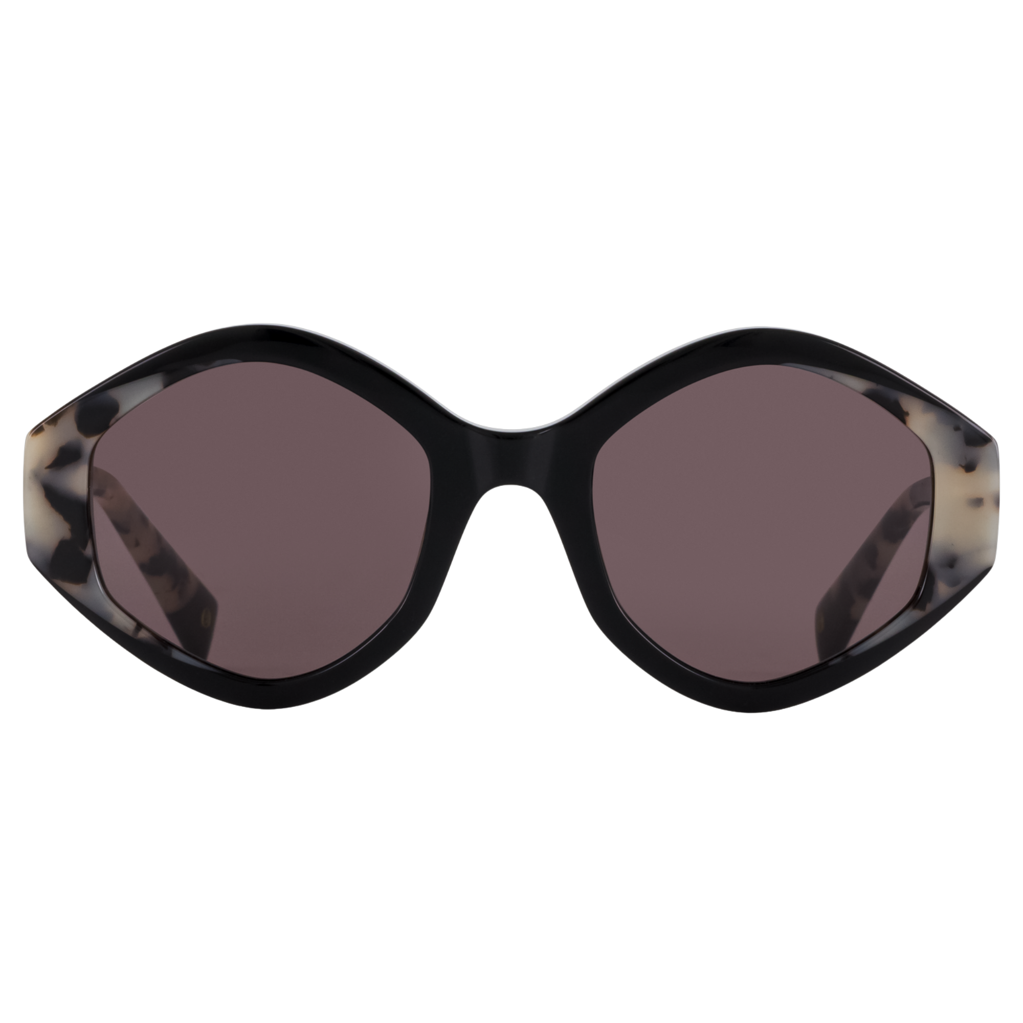 Monture solaire oversize à la géométrie affirmée. Le jeu de laminations colorées entre plaques translucides et écailles teintées crée un effet matière raffiné. Une esthétique au...