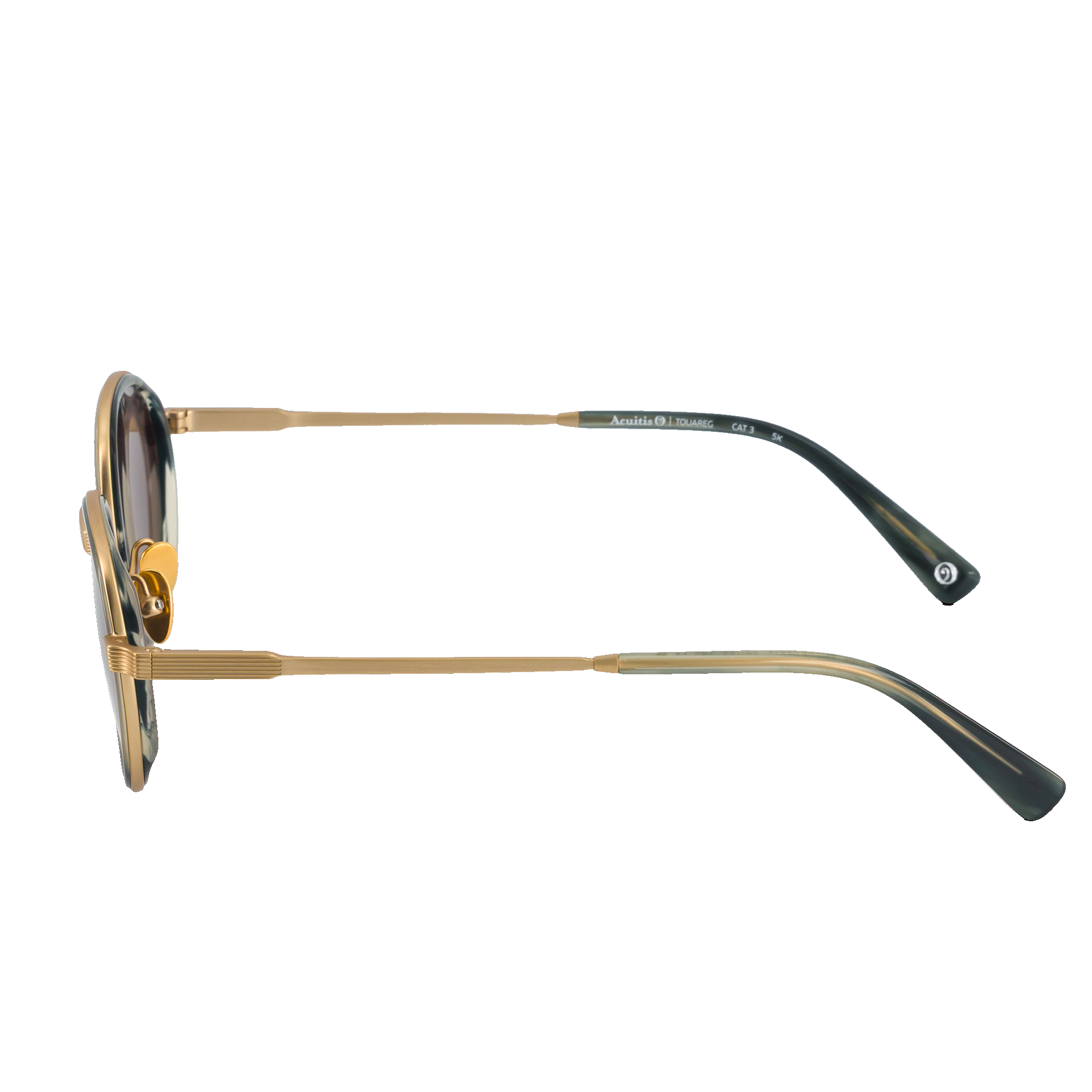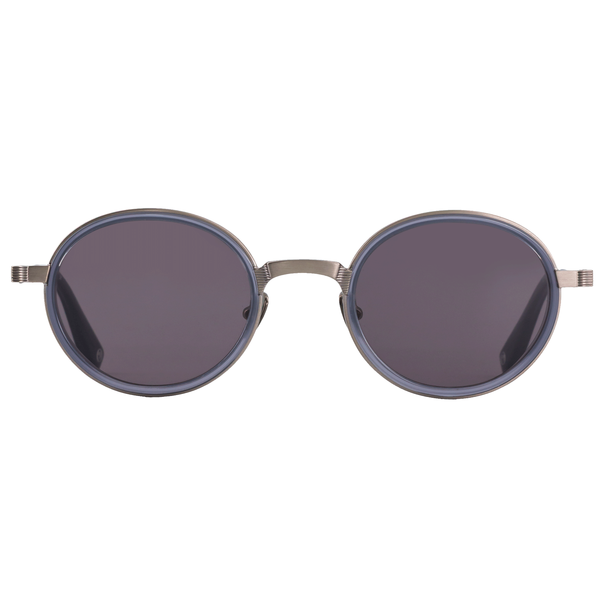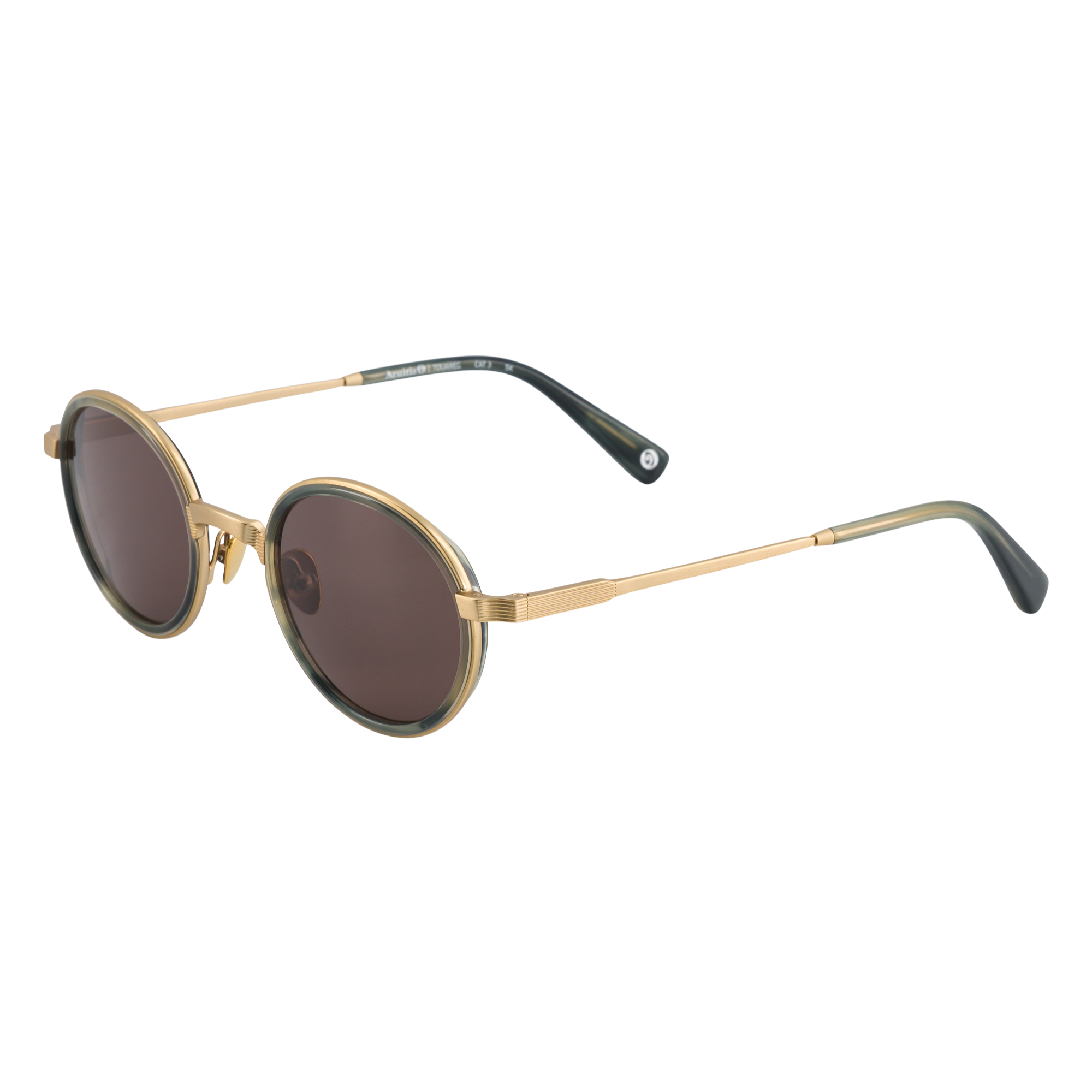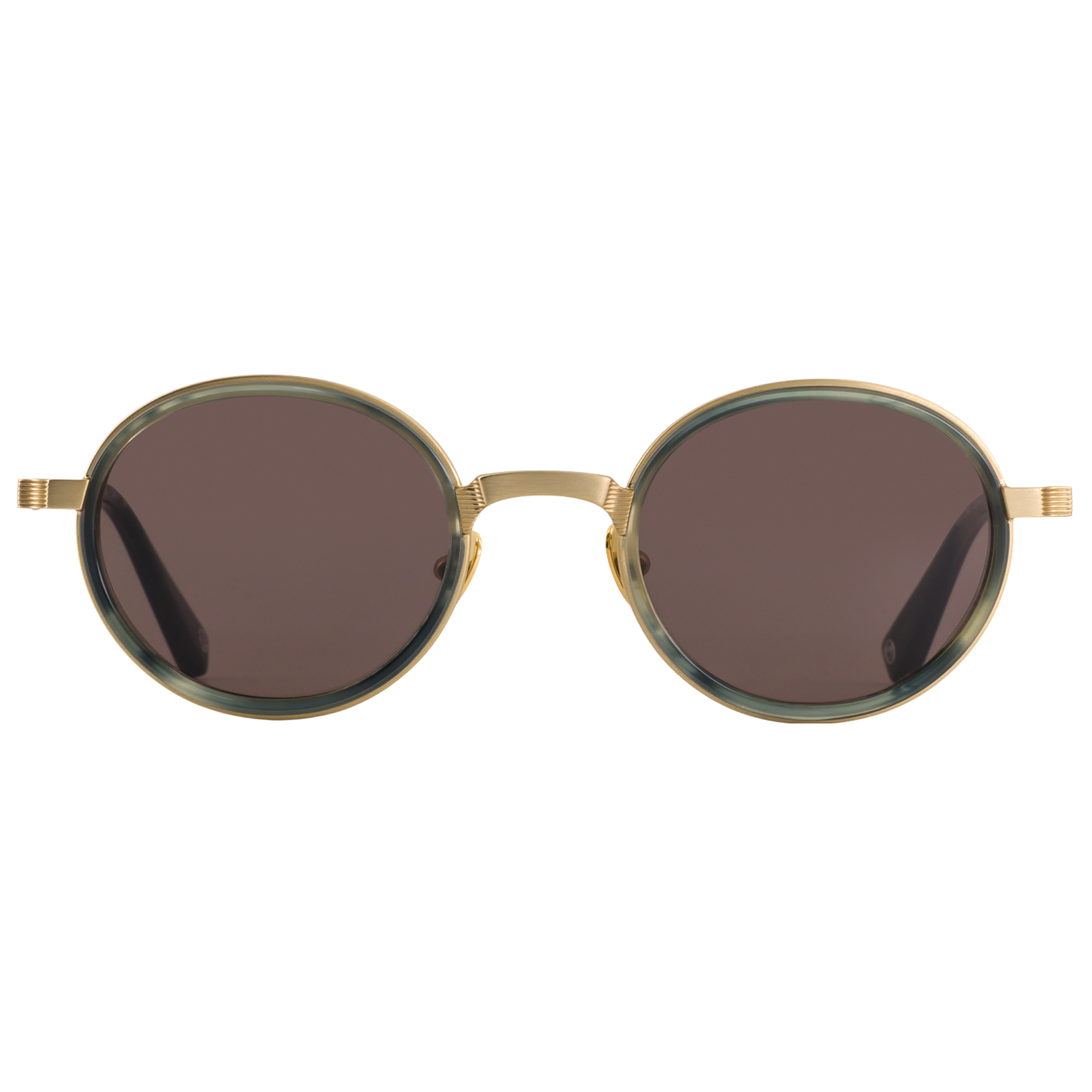 Monture ovale contemporaine combinée, de taille standard, associant finesse métallique et inserts d’acétate coqués. Les gravures détaillées sur le pont, les branches et les tenons soulignent une élégance technique et raffinée. Déclinée en écaille, corne verte, cristal transparent et gris opal, avec finitions métal gun, or et argent.