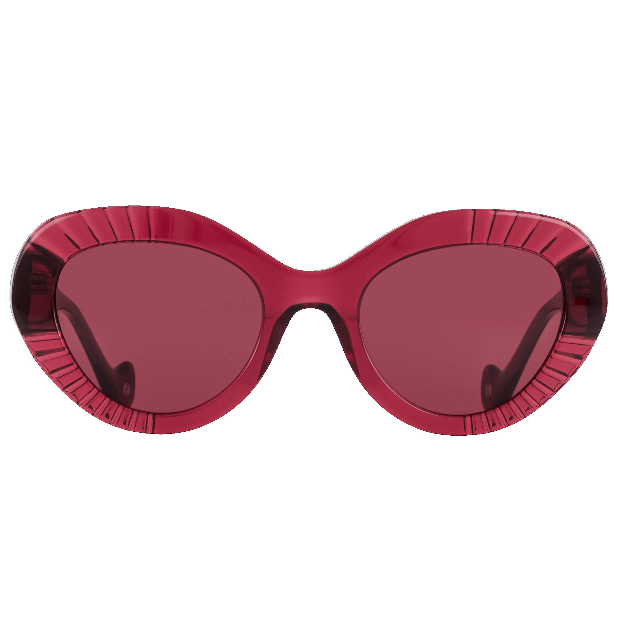 Monture cat-eye en acétate aux courbes sensuelles et raffinées. Son volume généreux révèle des motifs circulaires en déforçage au revers, créant de subtils halos lumineux. Décli...