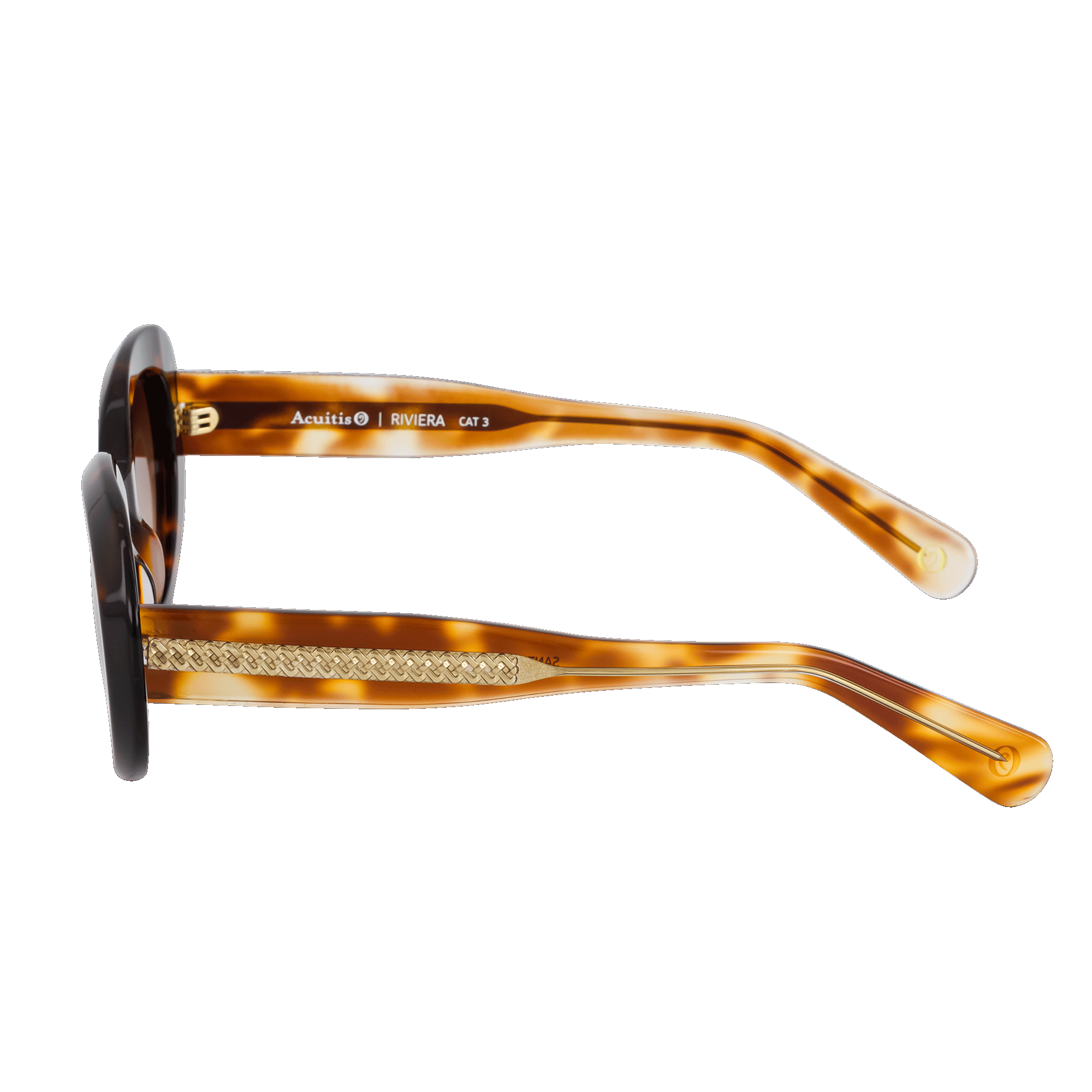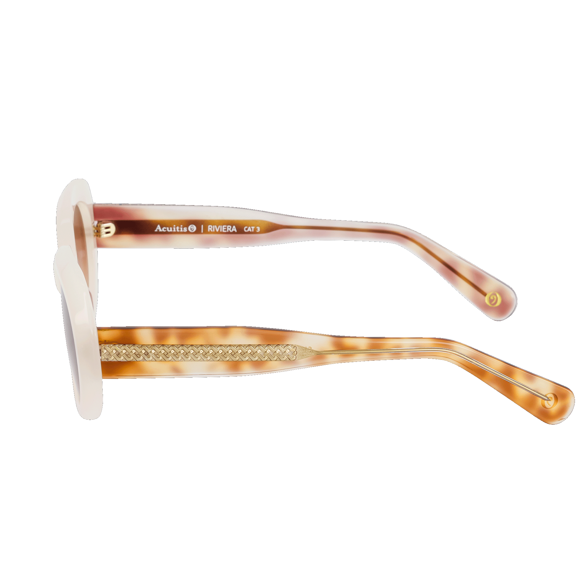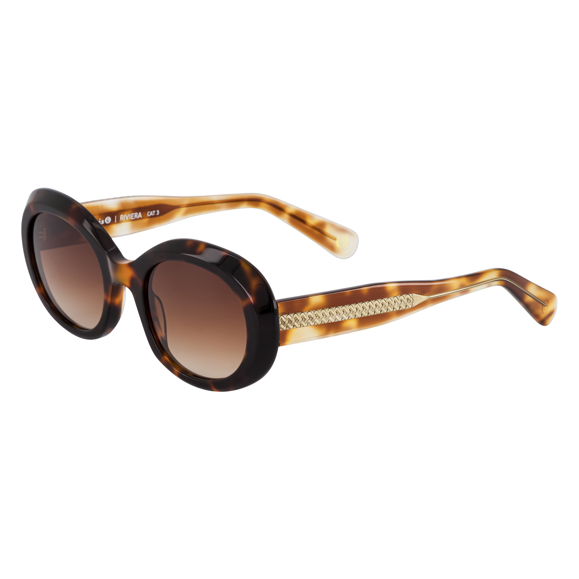 Monture féminine à l’esprit Riviera, reconnaissable par sa soie insérée. Forme oversize ovale, proposée en noir profond, écailles brunes/rosées et teintes nude.